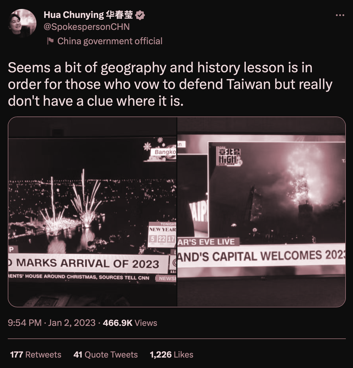 The combination of the two reporters talking about Bangkok from different locations, Kristie asking Will about his Thailand experiences, and the missing B-roll led to an unfortunate screen grab, where Will’s location was noted as “Taipei, Taiwan”, while the banner at the bottom of the screen wrote “Thailand’s Capital welcomes 2023”, alluding that CNN would mistake Taiwan for Thailand.