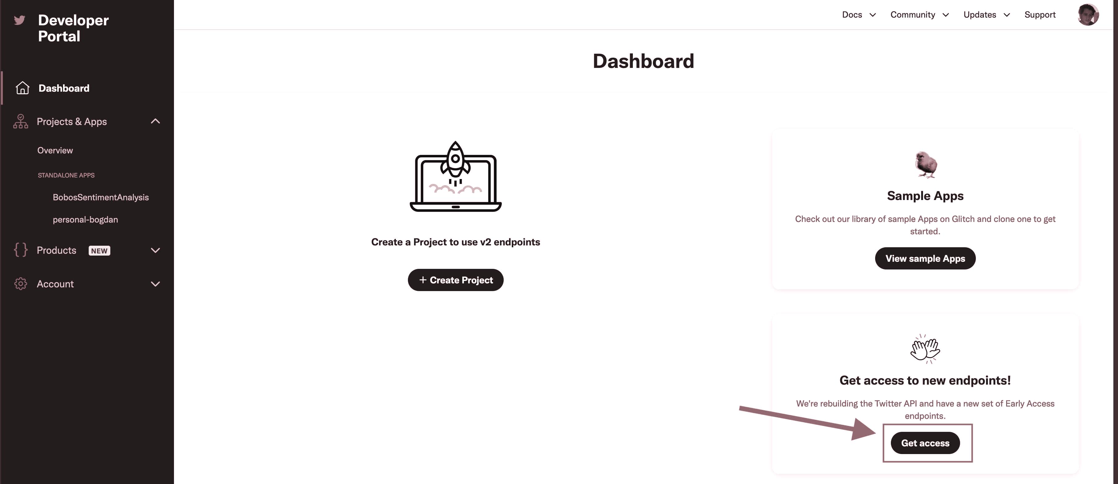 You should see “Developer Portal” right at the top, on the right-hand side next to your profile picture. Click that to navigate to your Twitter API Dashboard.