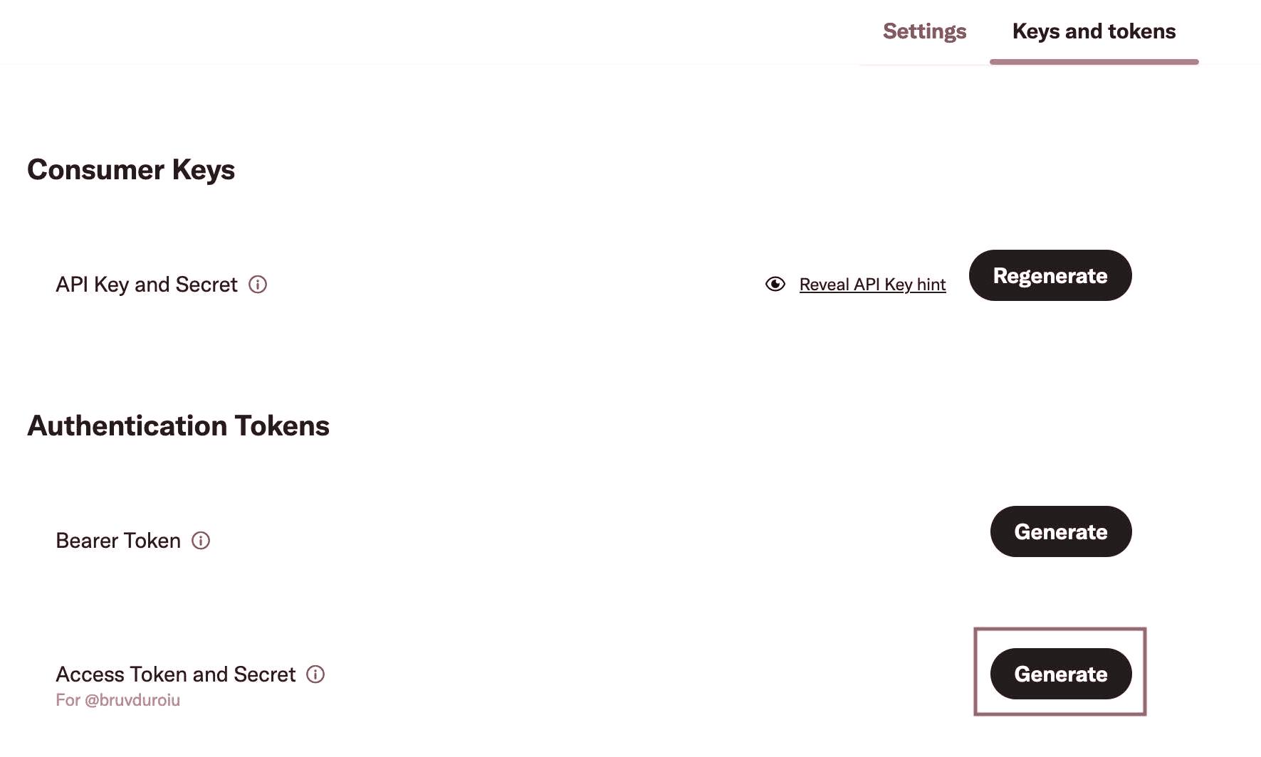 Under Authentication Tokens -> Access Token and Secret, hit Generate.
